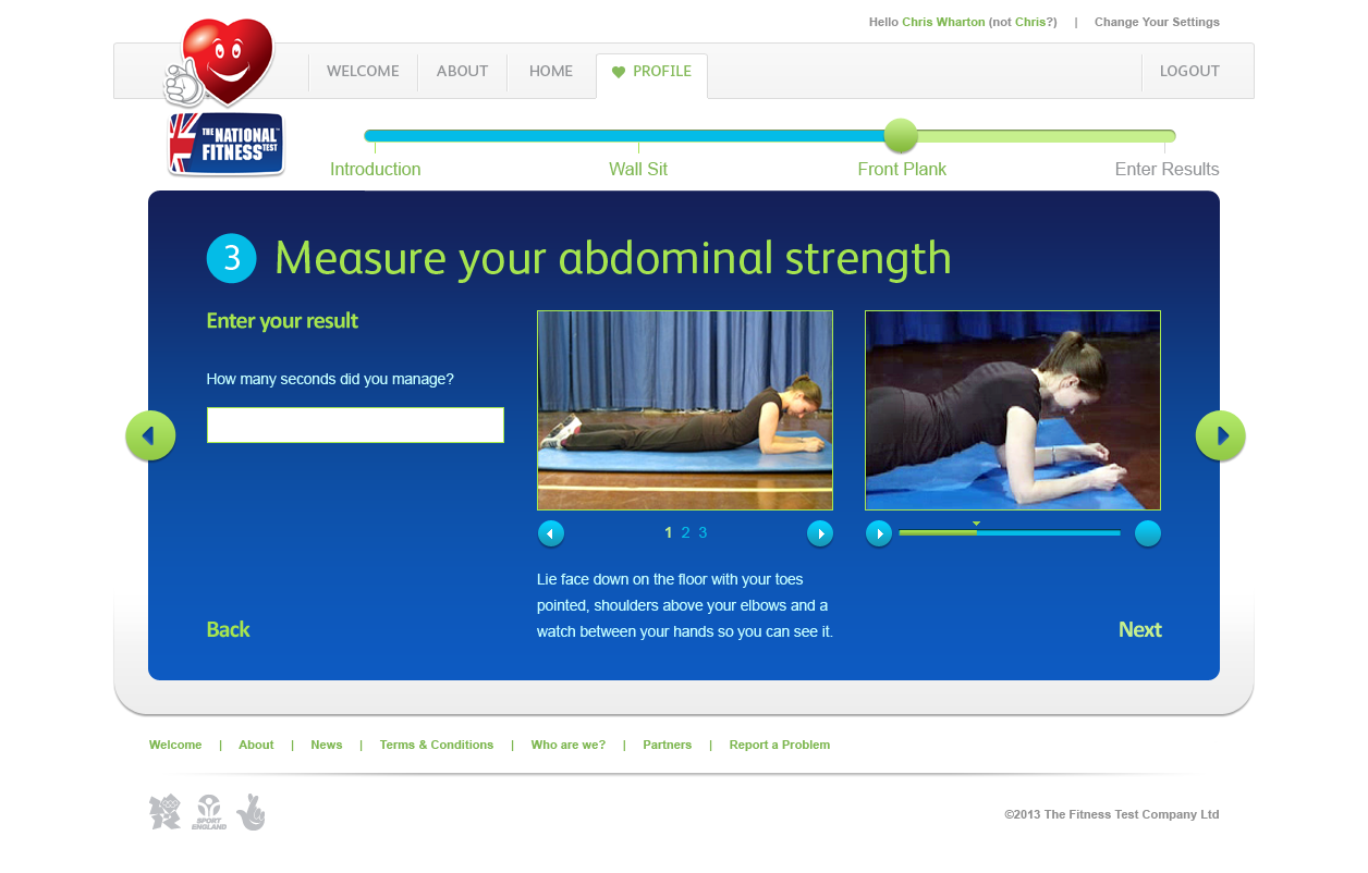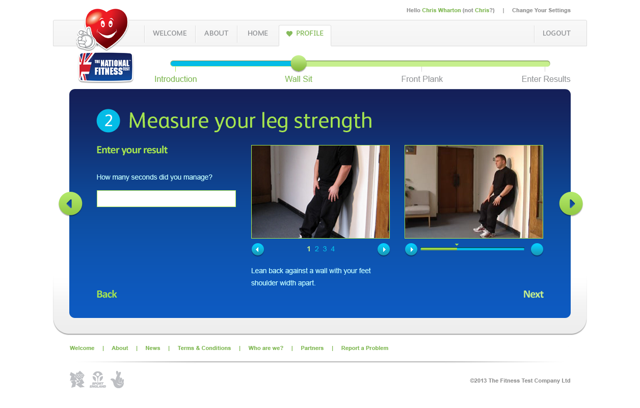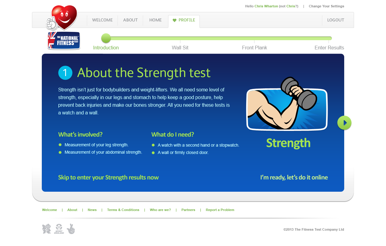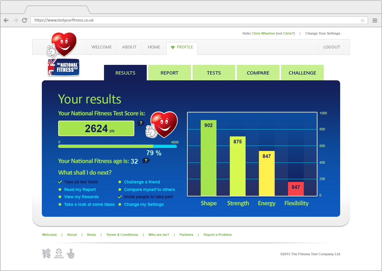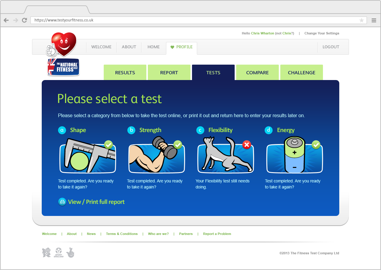 The National Fitness Test is devised to help the general public get to grips with with the state of their fitness. Aimed at everyone, not just those who take regular exercise but the less than sporting too, we came up with a friendly, colourful interface to help guide them.